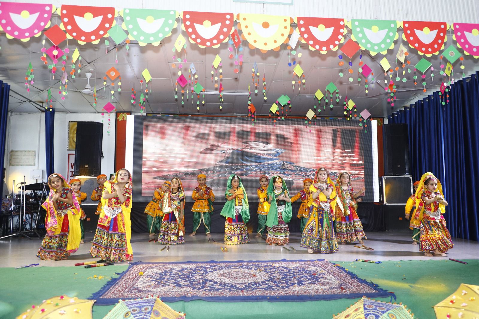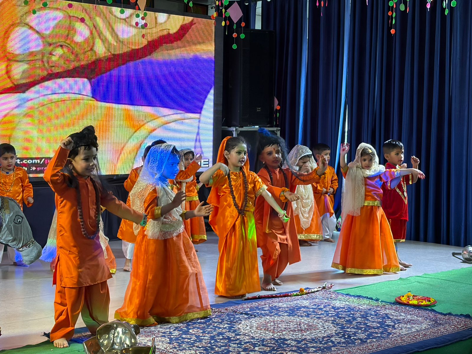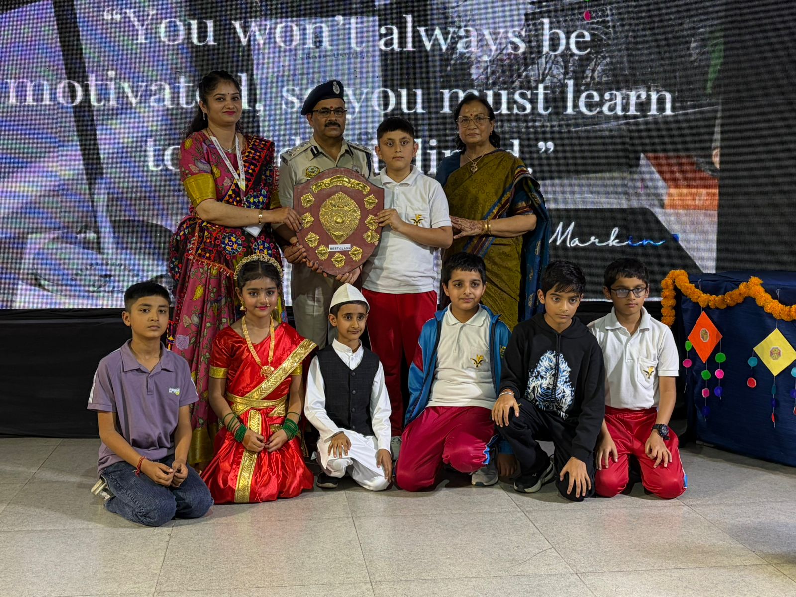 Dances and speeches by Vanya, Aanav, Harshita, Bhairvi, and Aavya kept the audience entertained and connected throughout. The Gandhi Train Act, Charkha Scene, and Dandi March paid tribute to the Father of the Nation and his ideals. The Role Play of Jhaverchand Meghani, Sardar Vallabhbhai Patel, and Panna Lal Patel, along with the Gujarati Dance, Song, and Garba, celebrated the pride and cultural richness of Gujarat.